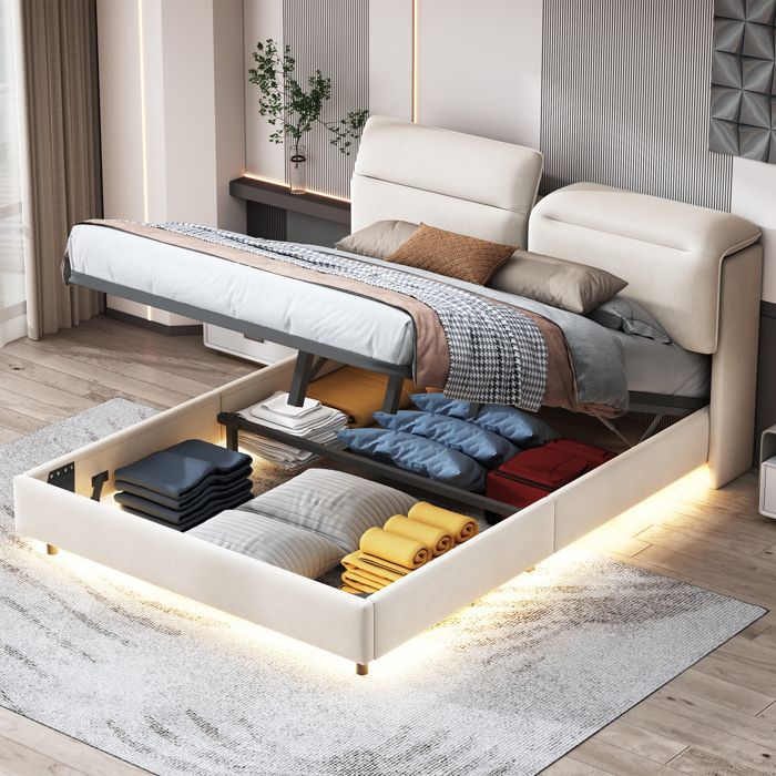 Lit double avec rangement tête de lit LED cadre de lit avec sommier à lattes lit coffre led lit capitonne coffre 160x200 beige