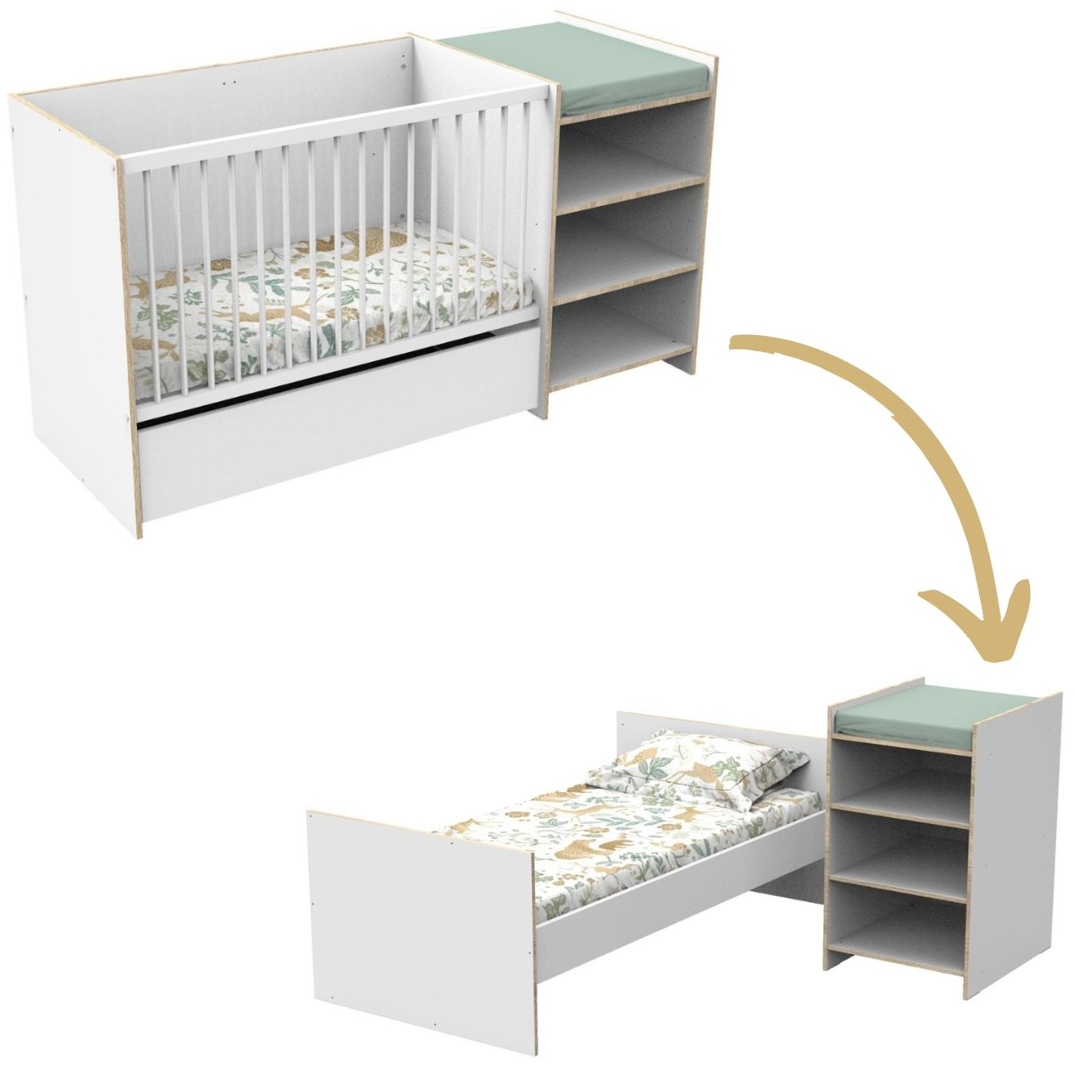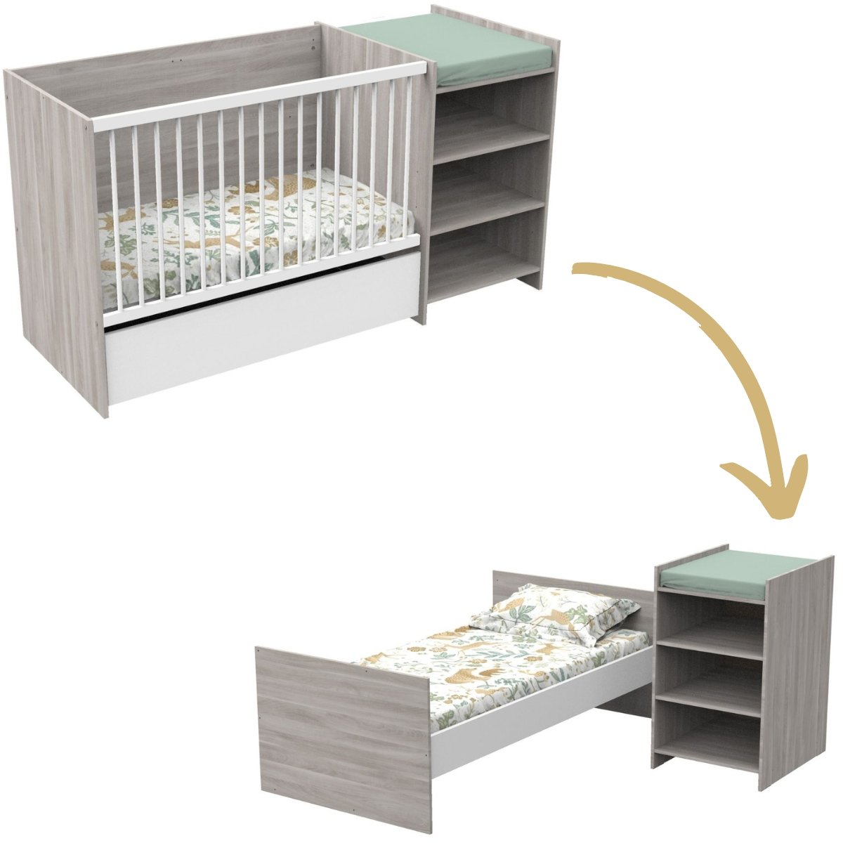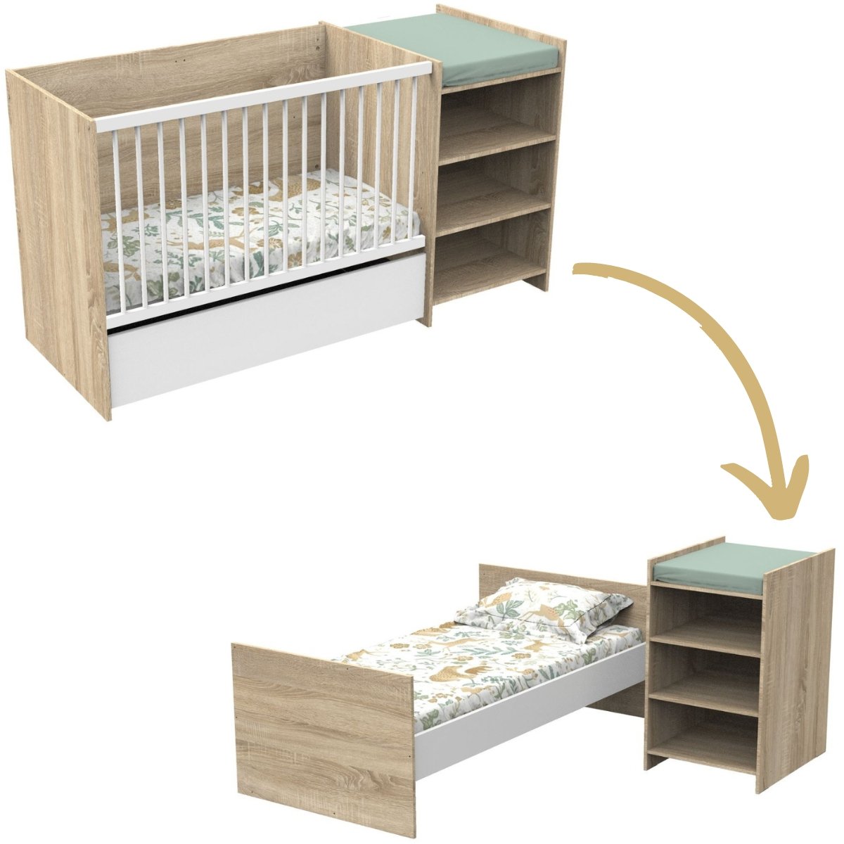 Lit bébé combiné - 120x60cm - Evolutif en 90x190cm - Babyprice Up - Décor bois - Avec commode à langer étagère