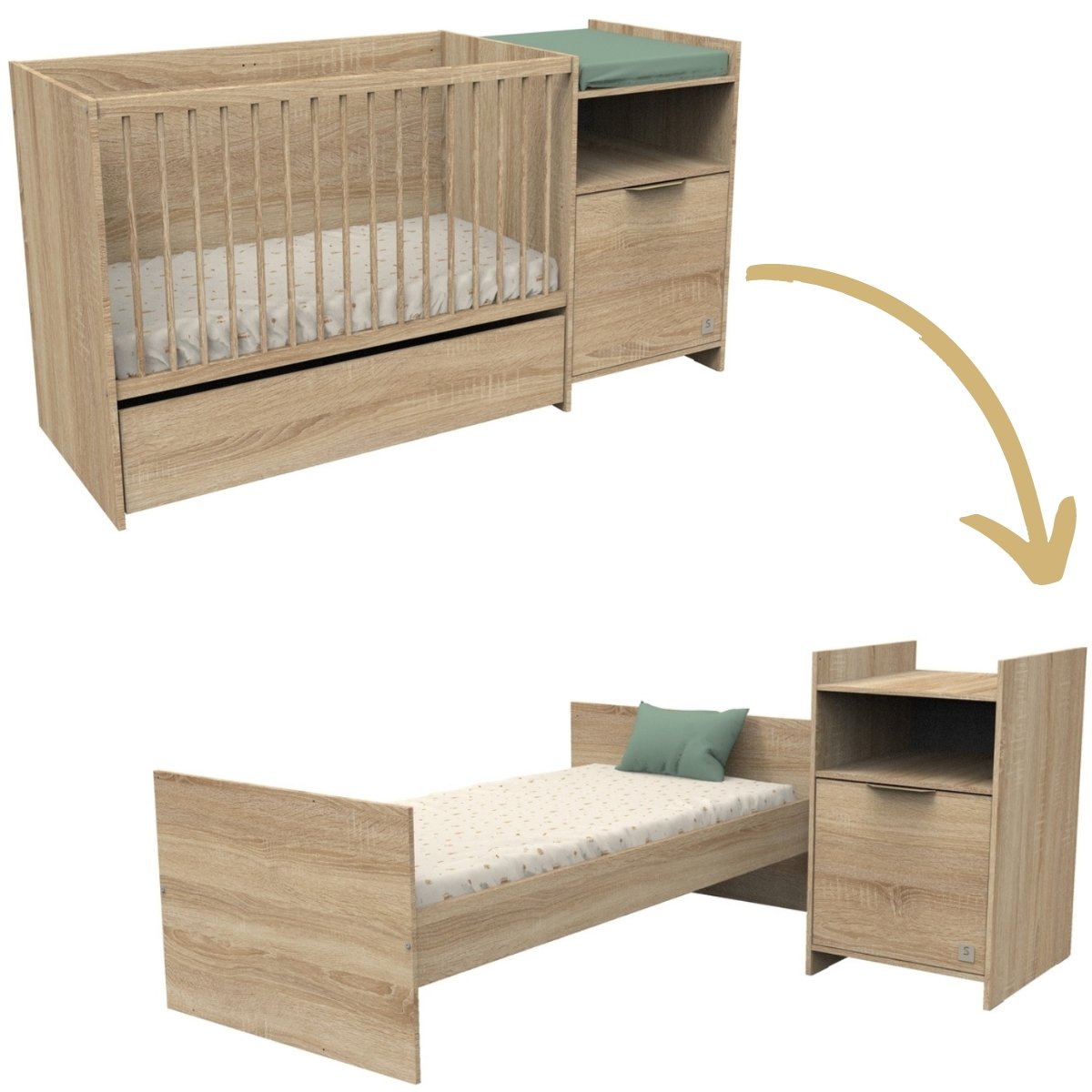 Lit bébé combiné - 120x60cm - Evolutif en 90x190cm - Babyprice Up - Décor bois - Avec commode à langer 1 porte