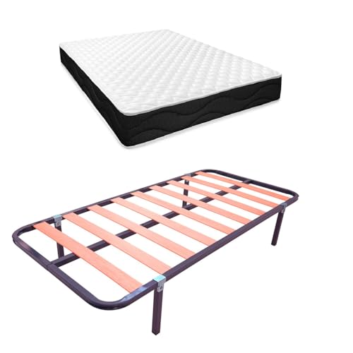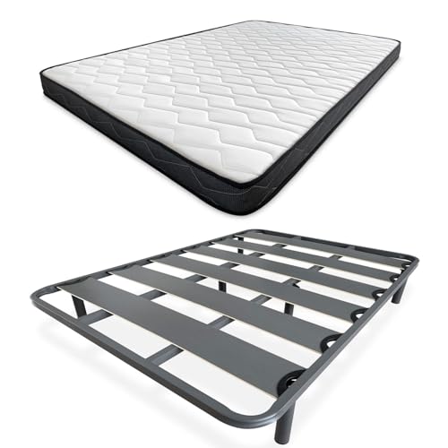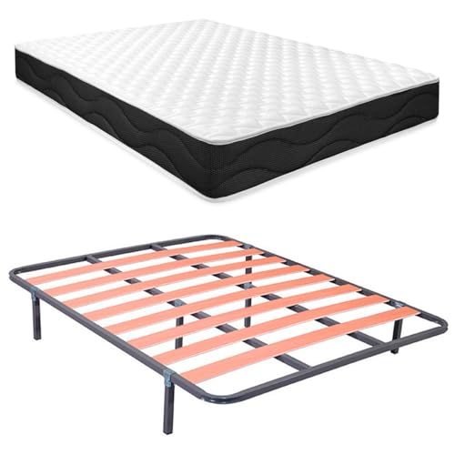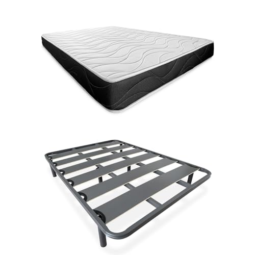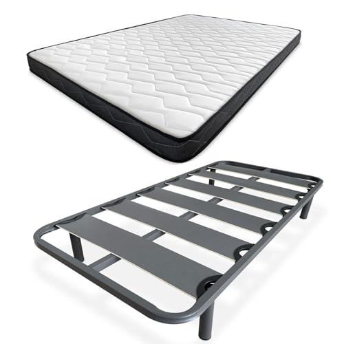 DUÉRMETE ONLINE Lit Complet avec Matelas viscoélastique réversible + sommier renforcé 40 x 30 mm avec 6 Pieds métalliques filetés, 135 x 190 cm