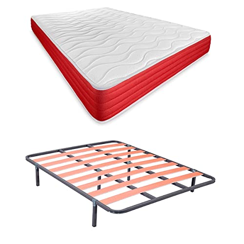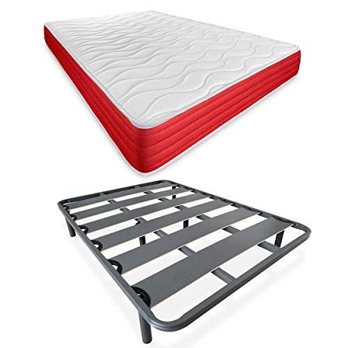 DUÉRMETE ONLINE Lit Complet avec Matelas Lite réversible (Face Hiver/été) + sommier renforcé 40 x 30 mm avec 6 Pieds métalliques filetés, 135 x 190 cm