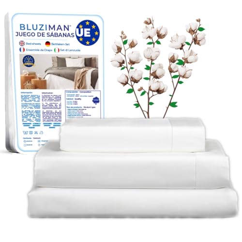 BLUZIMAN® Parure de Lit Premium Complet, Fait à La Main en Espagne, 100% Coton Naturel Égyptien, Comprend 1 Drap Housse, 1 Drap Plat et 1 Taie d'oreiller 125x45cm (Blanc, Lit 105)