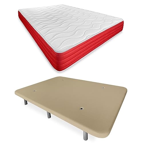 DUÉRMETE ONLINE - Lit Complet avec Matelas Viscotec Réversible + Base Rembourrée Renforcée Beige avec 6 Pieds Métalliques Filetés 150 x 190