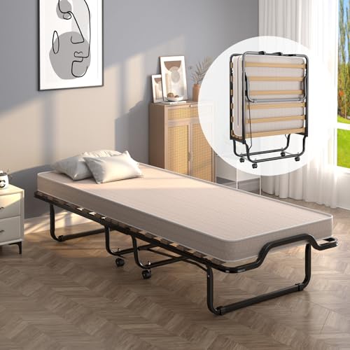 COSTWAY Lit Pliant 1 Personne Adulte 80 x 190 cm avec Matelas Orthopédique en Mémoire 6,5 cm, Charge 130 kg, Lit d’Appoint Pliable à 4 roulettes et Sommier à 15 Lattes de Bois pour invité, Beige