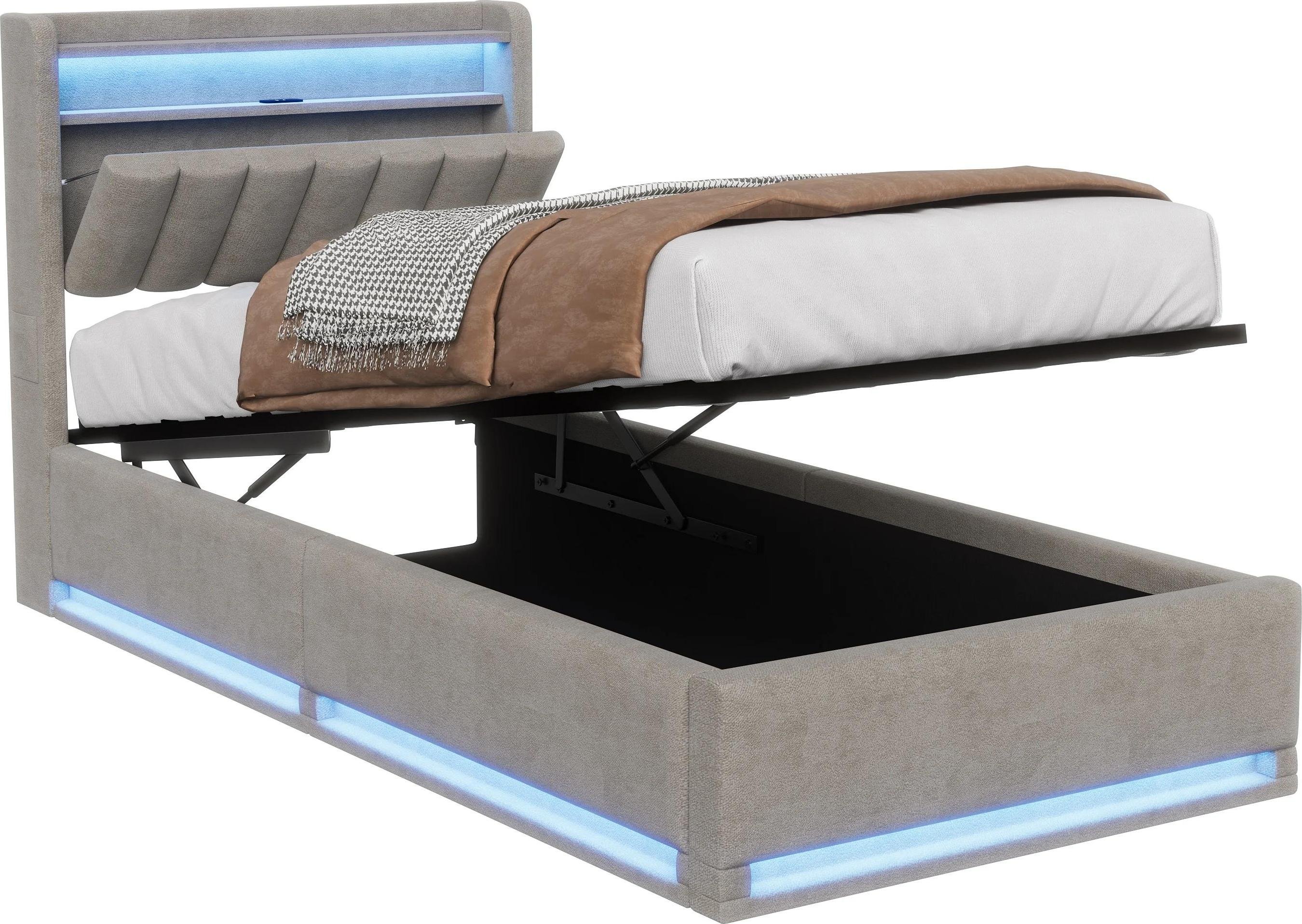 Lit Double 140x190 LED Rembourré Lin Gris Tête Escamotable Hydraulique avec Rangements(sans Matelas)