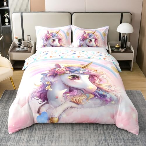 Cartoon Licorne Coton Housse de Couette 140x200,Rose Paillettes Mignon Parure de Lit,Fille Princesse Arc en Ciel Fantaisie Double Face Étoiles Linge de Lit,Thème de Fée Couvre Lit pour Enfants