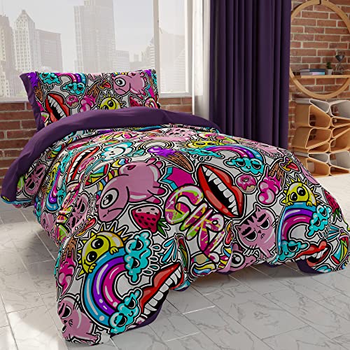 Bedlam Housse de couette licorne phosphorescente - Lit double 200 x 200 cm - Réversible 2 motifs - Parure de lit rose magique et lilas pour fille - 2 taies d'oreiller - Motif étoile et licorne