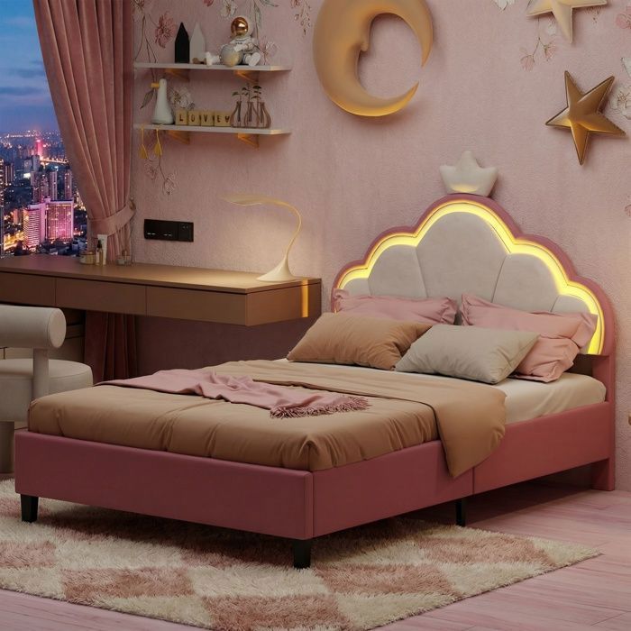 Lit Double fille 140x200 cm - Lit Enfant avec LED - Tête de Lit réglable - Structure de Lit - Sommier à Lattes - Velours - Rose