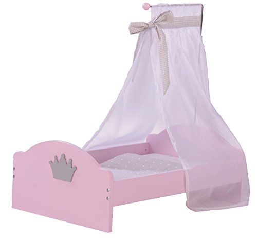 roba Lit de Poupée en Bois Princess Sophie - Inclus Textile - Couverture + Oreiller + Ciel de Lit et Support - Rose / Gris, 53 x 34.5 x 52 cm