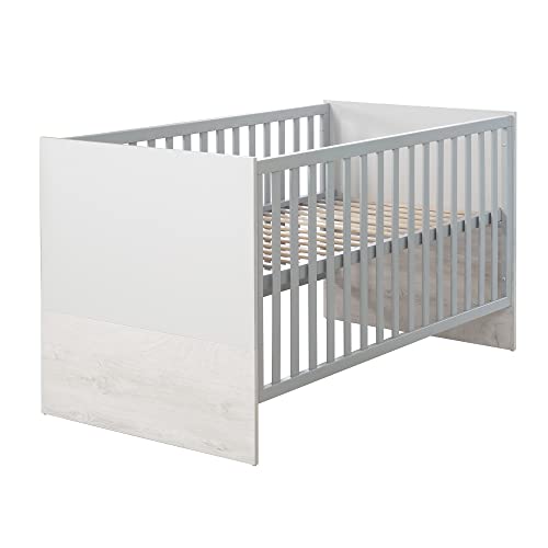 roba Lit Bébé Évolutif en Bois "Helene" - 70x140 cm - Hauteur Réglable - 3 Barreaux Amovibles - Gris clair/Décor Bois