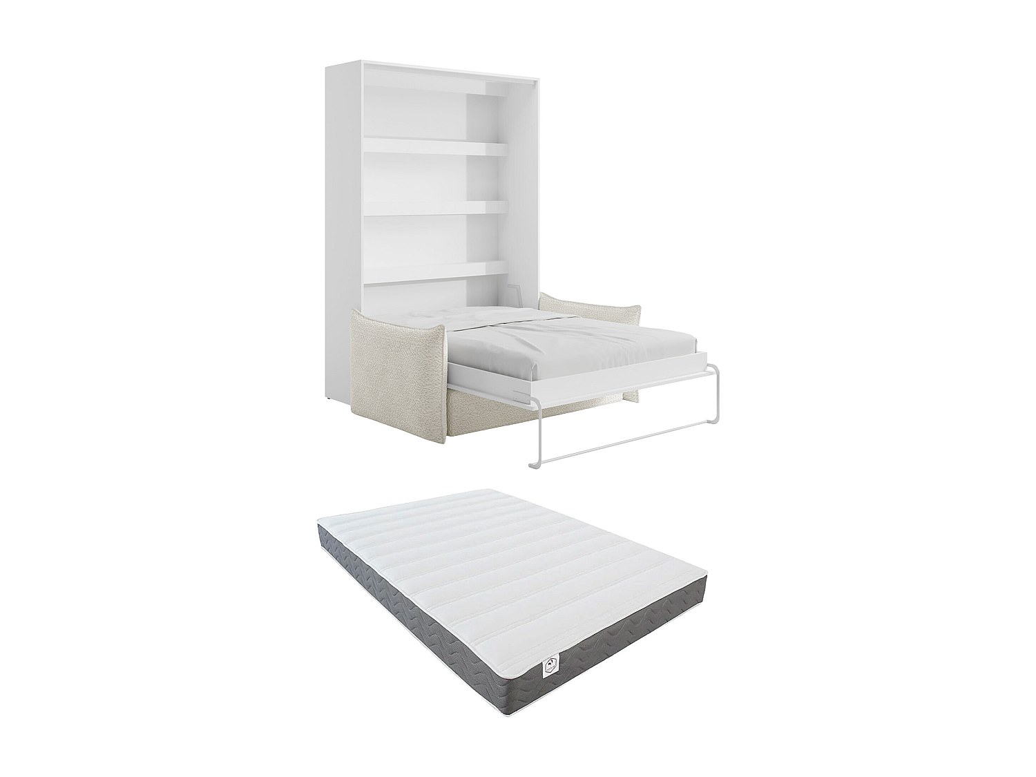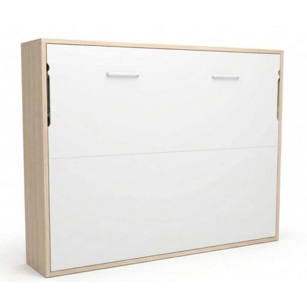 Lit escamotable 160x200 avec canapé et bibliothèque moba-coffrage blanc-façade frêne 3d-canapé beige
