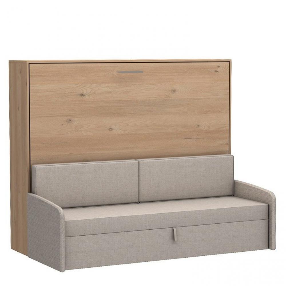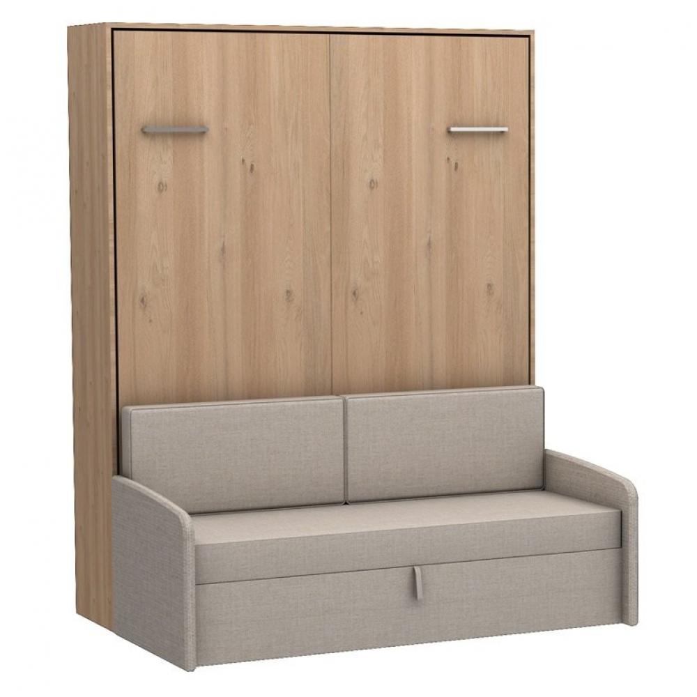 Lit escamotable horizontal avec canapé et rangement vetal-140x200-canapé beige-structure chêne clair