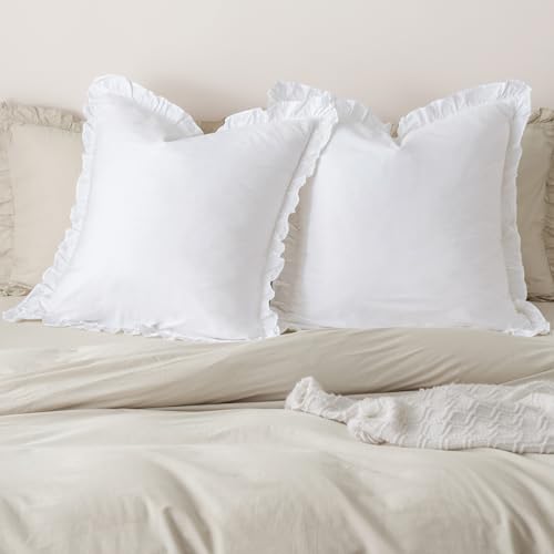 Lot de 2 Housses de Coussin 100% Coton lavé avec Volants, 66 x 66 cm, taies d'oreiller européennes, sans Coussin, Housses de Coussin décoratives Ultra Douces pour lit et canapé (Blanc)