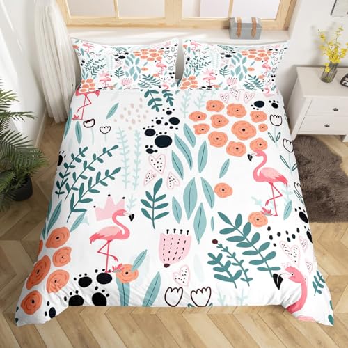 Homewish Housse de Couette 220x240 Enfant Flamant Rose Kawaii, Parures de Lit Ado Fille Dessin Animé Flamant, Sets de Housses de Couettes Fleur À Feuilles, Couvre Lit Imprimé Patte d'animaux