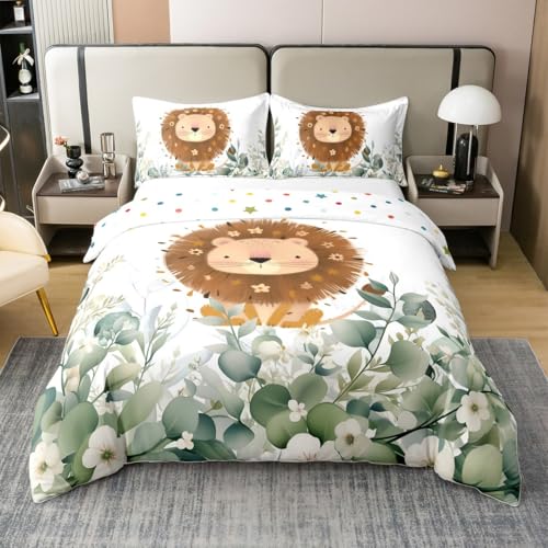 Coton Enfants Mignon Lion 220x240 Housse de Couette,Dessin Animé Jungle Animaux Parure de Lit,Eucalyptus Vert Literie Set,Feuilles de Plantes D'Aquarelle Couvre Lit Garçon Fille