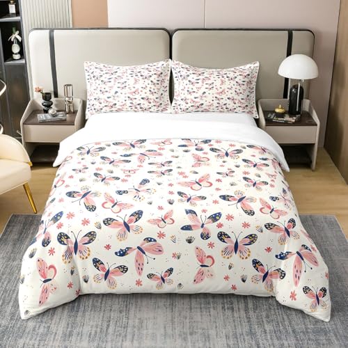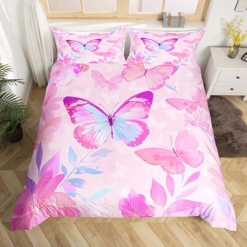 Homewish Housse de Couette 200x200 Enfant Papillon, Parure de Lit Ado Fille Fleurs Papillons Esthétiques, Sets de Housses de Couettes Fleurie Papillon de Dessin Animé, Couvre Lit Aquarelle Rose