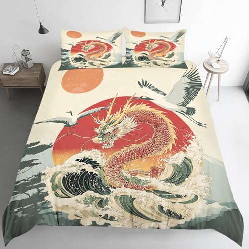 ZyxMehtic Housse de Couette 135x200 Dragon Asiatique Enfant, Parure de Lit Japonais 1 Personnes, Ensemble Literie Vintage Microfibre avec 1 Taie d'oreiller 65x65 cm avec Fermeture Éclair