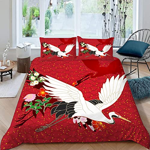 VASENA Housse de Couette 220x240 Ado Adulte Parure de Lit Style Japonais Rouge Grue Japonaise Housse de Couette en Microfibre Hypoallergique Ensemble de Literie avec 2 Taies d'oreiller