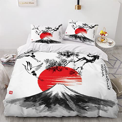 XPINGO Parure de lit Japonais 200x200 cm 1 Personne 3D Grue Mont Fuji Housse de Couette avec Fermeture Éclair Garcon Fille Microfibre Ensemble de Literie 3 Pièces avec 2 Taies d'oreiller 50x75