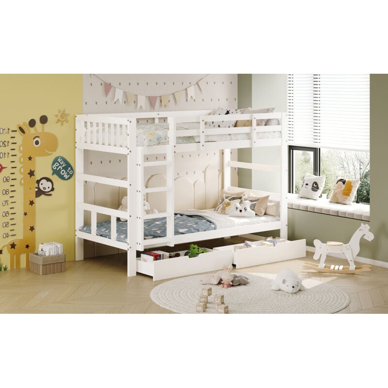 Pergar - lit mezzanine 90x200,lit mezzanine 2 places,Lit superposé enfant,Deux lits amovibles de 90x200,2 tiroirs de rangement,Bois de pin massif