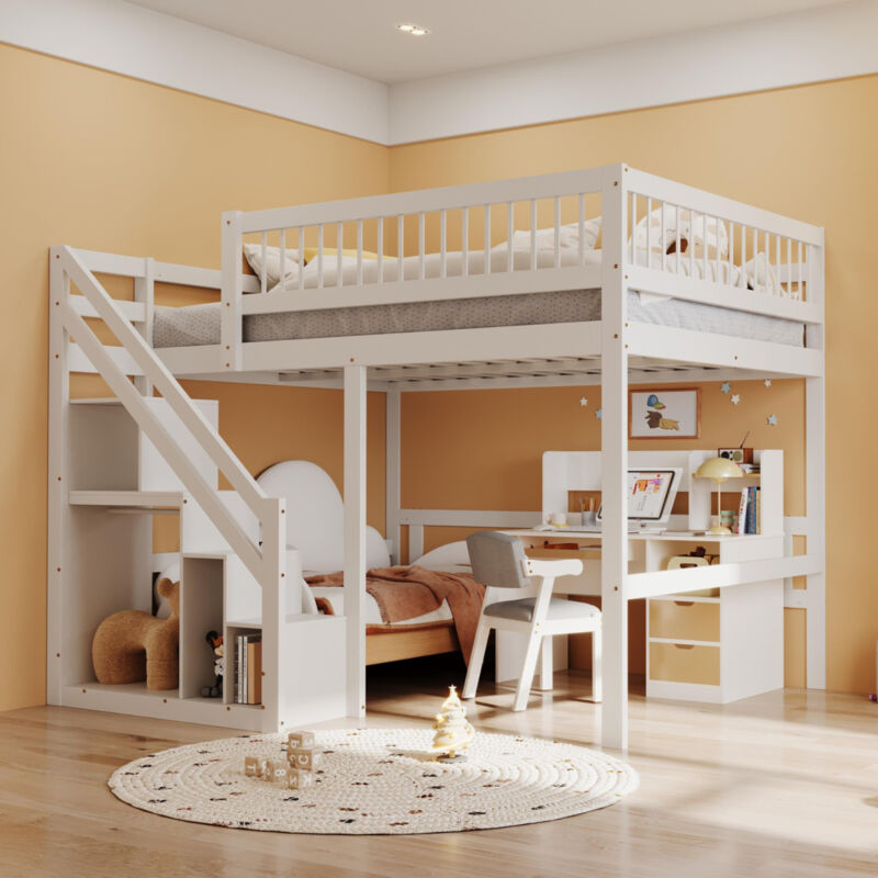 Lit superposé enfant 140x200, lit mezzanine 2 places,lit mezzanine escalier,avec placard de rangement,lit jeune, lit simple,bois massif,Blanc