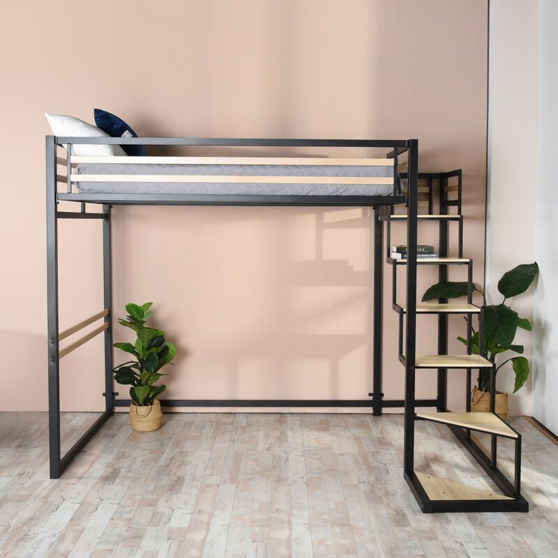 Lit Mezzanine 2 Places en Métal Lit Mezzanine 140x200 pour Enfant Adulte avec Escalier et étagère Armoire Ouvertes Couleur Noire