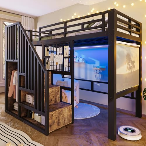 Lit mezzanine 140x200, structure métal lit mezzanine avec bureau, escalier rangement, led, ports usb