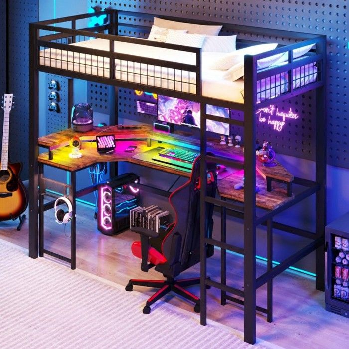 Lit Mezzanine 90x200 - LANGTU - Modèle Gamer - Bureau intégré - LED RGB - USB/Type-C & prises