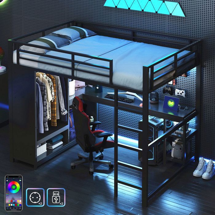 Lit Mezzanine 2 places 140x200 avec LED App Multiprise USB Lit Gaming Gamer Métal avec Bureau Penderie et Rangement Noir