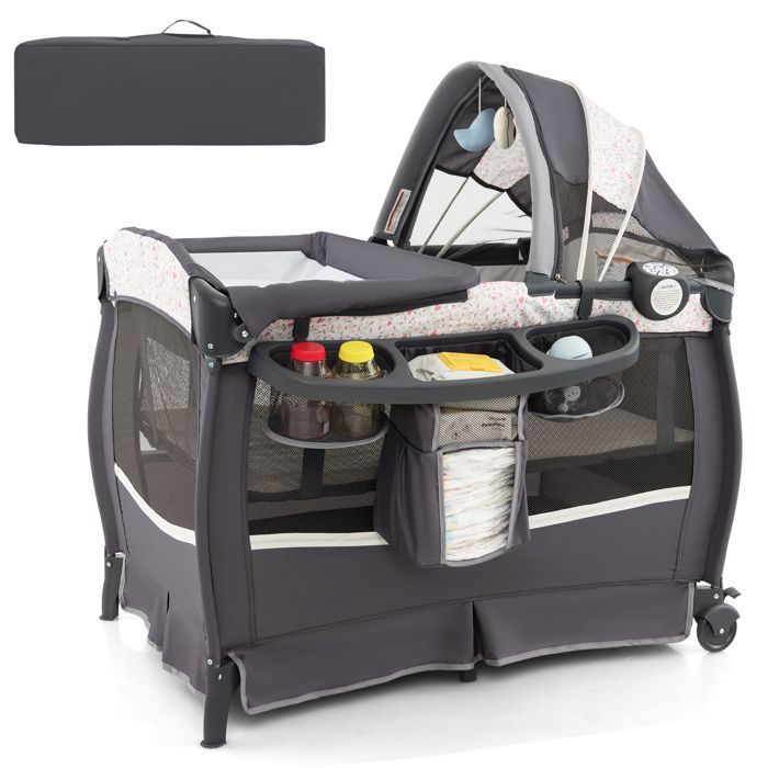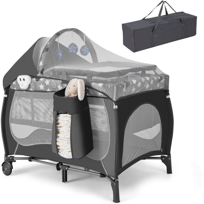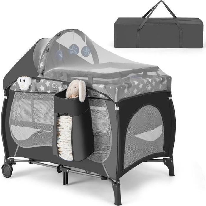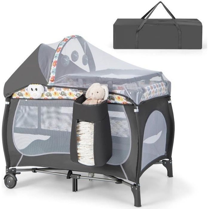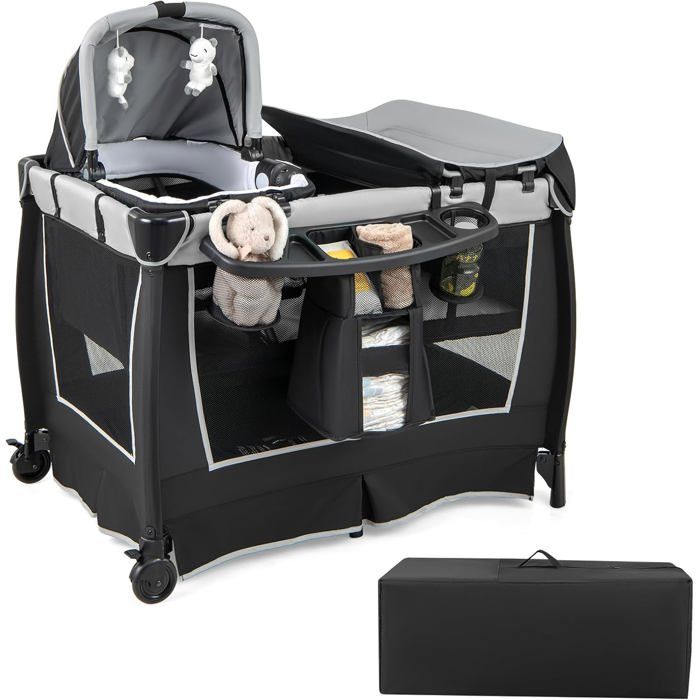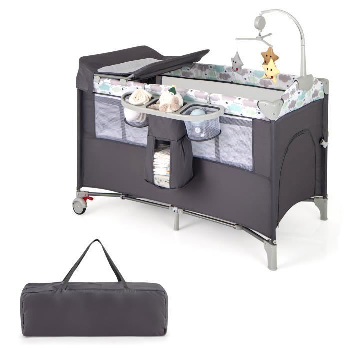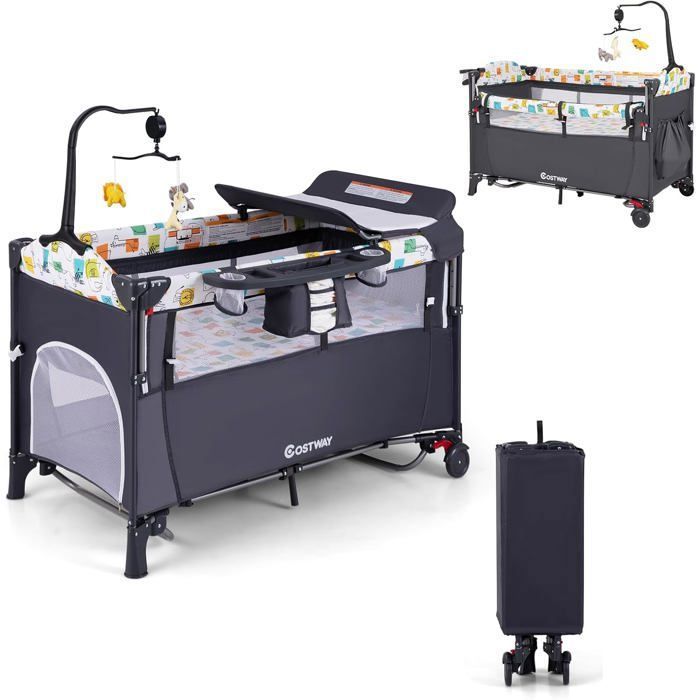 Costway 4 en 1 lit parapluie bébé 0-36 mois,table à lange pliable à 3 niveaux réglables avec jouets musicaux,matelas etc.,gris foncé