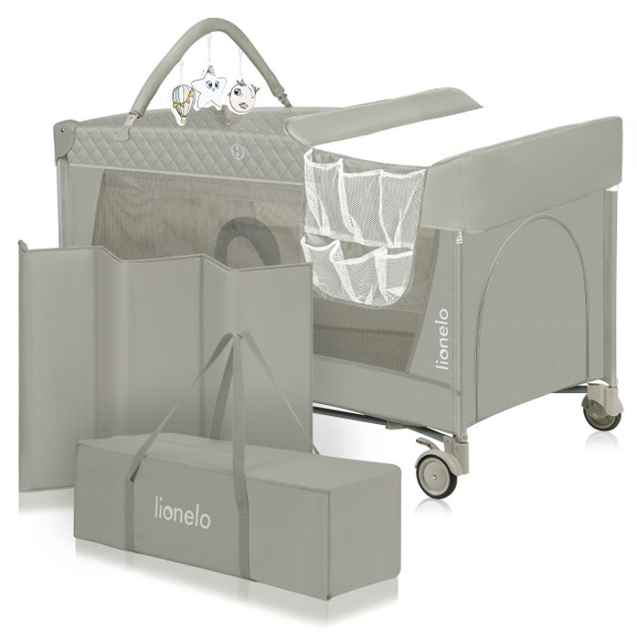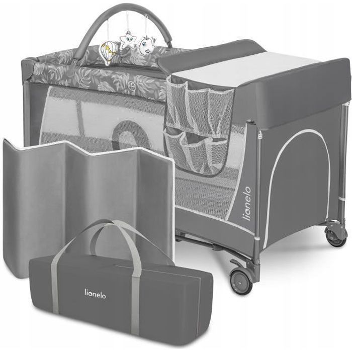 Lit parapluie compact 3en1 LIONELO Flower - Parc bébé - 0-36 mois - Sac de Transport - Pliage Rapide - Roulettes - Gris