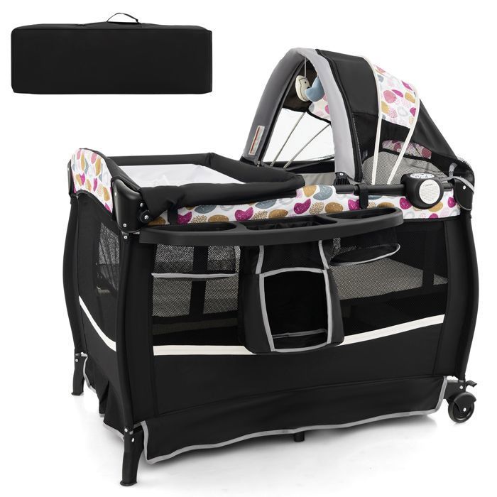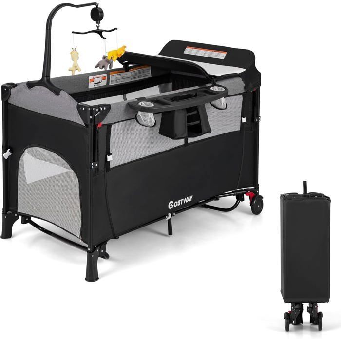 COSTWAY Lit Parapluie Bébé avec Matelas Pliant 5 en 1-Table à LangerBoîte à Musique-3 Jouets-4 Hauteurs dAccoudoir Réglables-Noir