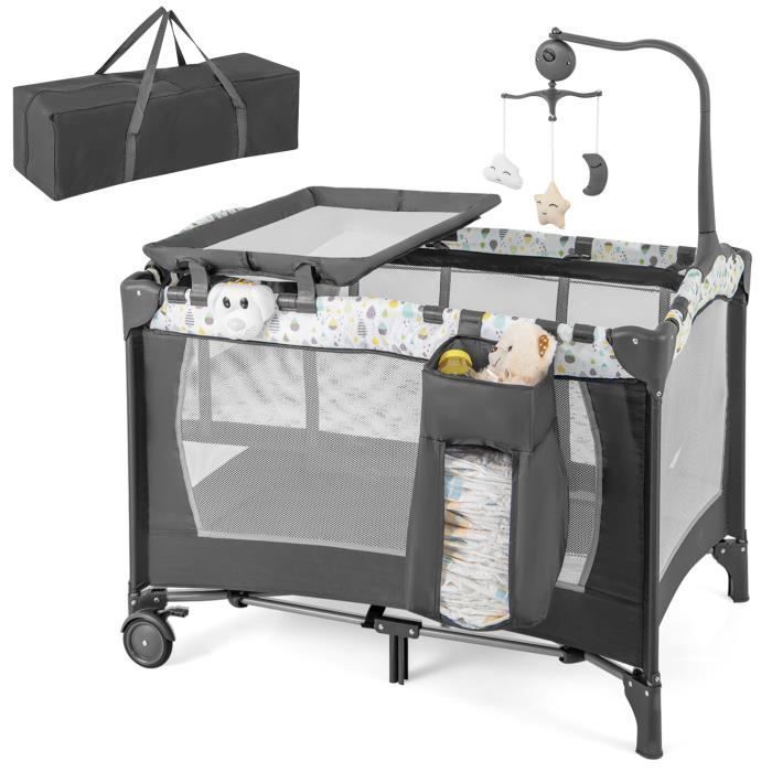 DREAMADE 5 en 1 Lit Bébé avec Table à Langer Lit Parapluie avec Matelas & Moustiquaire 3 Jouets Mignons & Boîte à Musique Gris