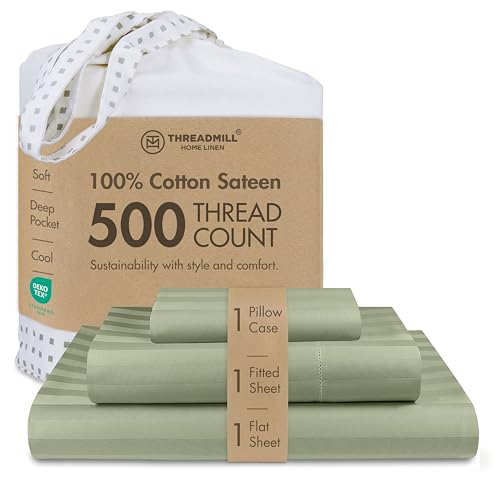 Threadmill Parure de lit 3 pièces en Coton Respirant à Rayures damassées, 500 Fils au Pouce carré, draps Respirants avec Poche Profonde élastique de 38,1 cm, 1 taie d'oreiller et Sac fourre-Tout