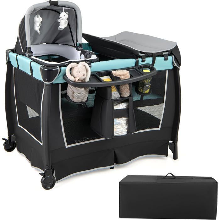 Costway 5 en 1 lit parapluie bébé avec matelas & table à langer, berceau bébé evolutif en tissu avec 2 jouets, roues verrouillables, sac de transport, 110x78cm, charge 10kg pour bébé de 0-3 ans