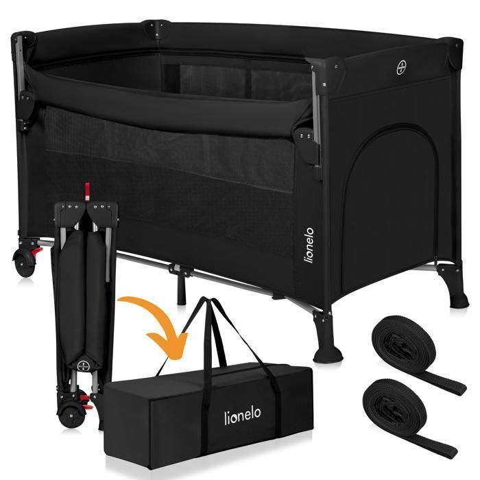 Lit parapluie 3en1 LIONELO Ellen - Lit cododo - Parc bébé - Matelas haute densité - 2 x Roulettes - 0-36 mois - Noir