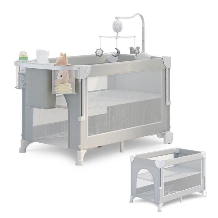 Lit Bébé Parapluie 5 en 1 avec Matelas Table à langer Moustiquaire Jouets Suspendus4 Hauteurs Réglables 0-3 Ans Gris