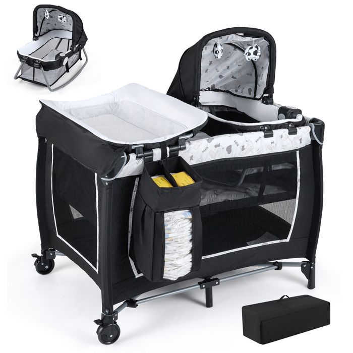 COSTWAY Lit Parapluie Bébé avec Matelas Pliant 5 en 1-Table à LangerBoîte à Musique-3 Jouets-4 Hauteurs dAccoudoir Réglables-Noir