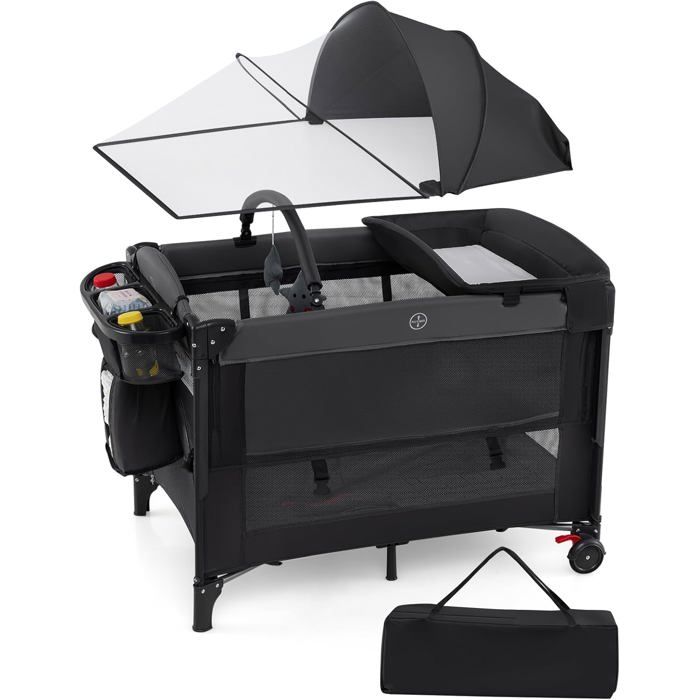 lit parapluie bébé pliant 4 en 1 avec matelas,filet amovible réglable,table à langer,sac de transport roues verrouillables