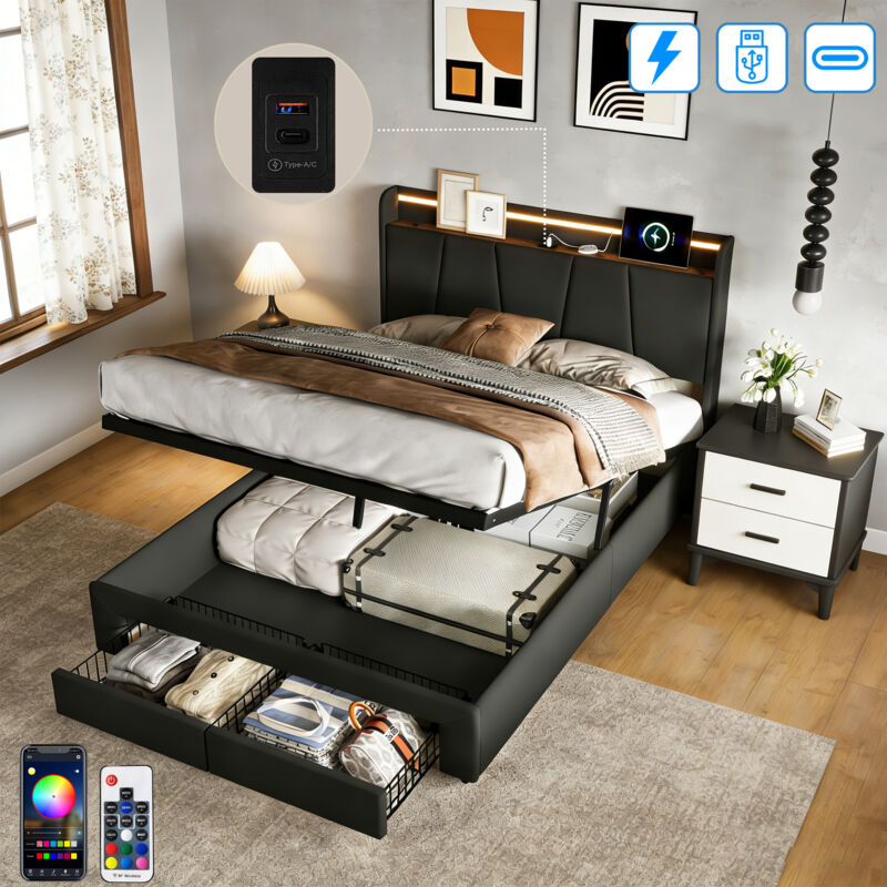 Lit Coffre 140x190 CM - avec LED et USB Tpye C - Tête de lit est Pliable - Rangement Hydraulique et 2 tiroirs - Lit 2 Personnes avec sommier - Lin