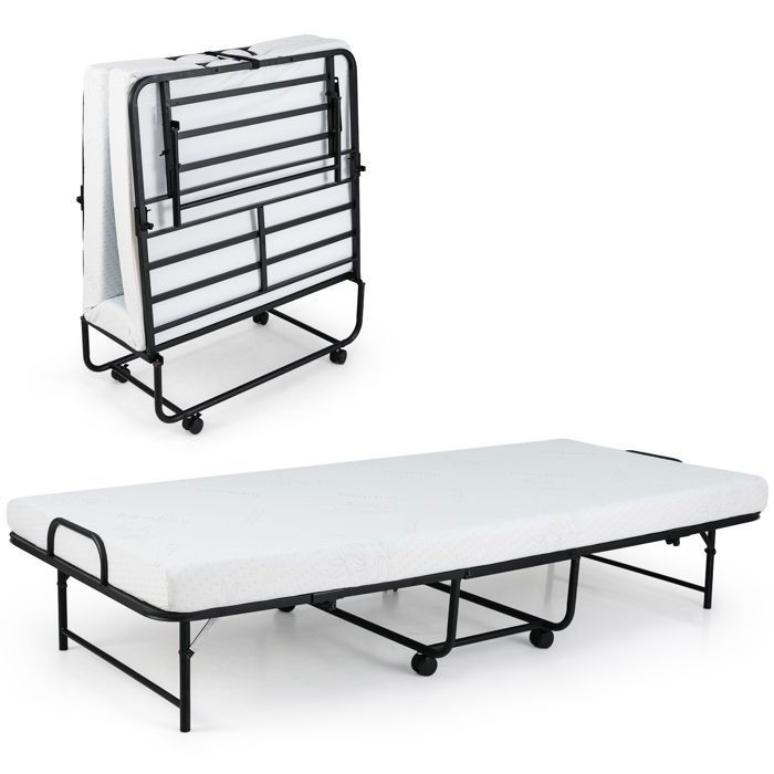 Costway lit pliant 1 personne adulte 191x96cm avec matelas en mousse à mémoire de forme de 10 cm, cadre de lit en métal, 4 roues universelles, rangement facile, pour bureau, chambre