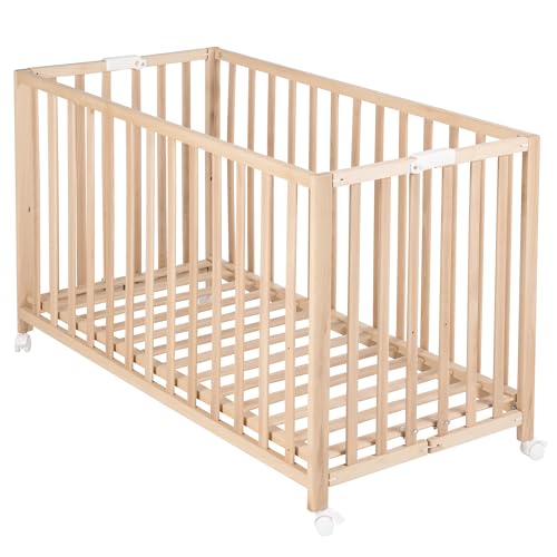 roba Lit Bébé Pliant en Hêtre "Fold Up" 60x120 cm - avec Roulettes à Freins - Naturel