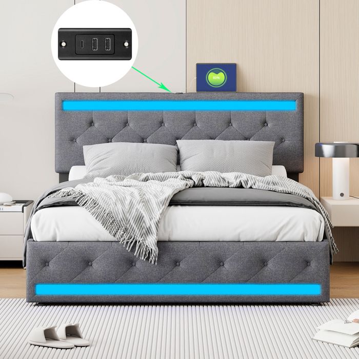Lit 160x200 avec Sommier et Rangement avec LED et USB Cadre de Lit pour Adulte/Ado Lit Rembourré 2 Personnes Lin Gris