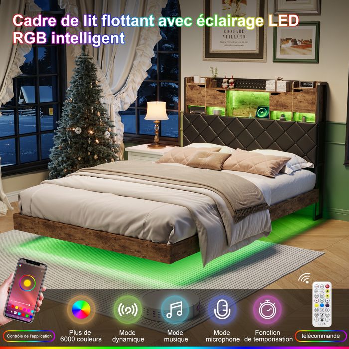 Lit flottant 140x200 cm lit rembourré avec LED et USB cadre de lit avec sommier lit double lit capitonné pour adulte/ado PU noir