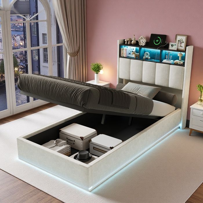 Lit 140x190 avec Sommier et Rangement avec LED et USB Cadre de Lit pour Adulte/Ado Lit Rembourré 2 Personnes Lin Beige