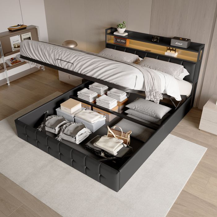 Lit coffre 160 x 200 avec LED et ports USB lit 2 Personnes avec tête de lit et sommier cadre de lit pour adulte et ado noir