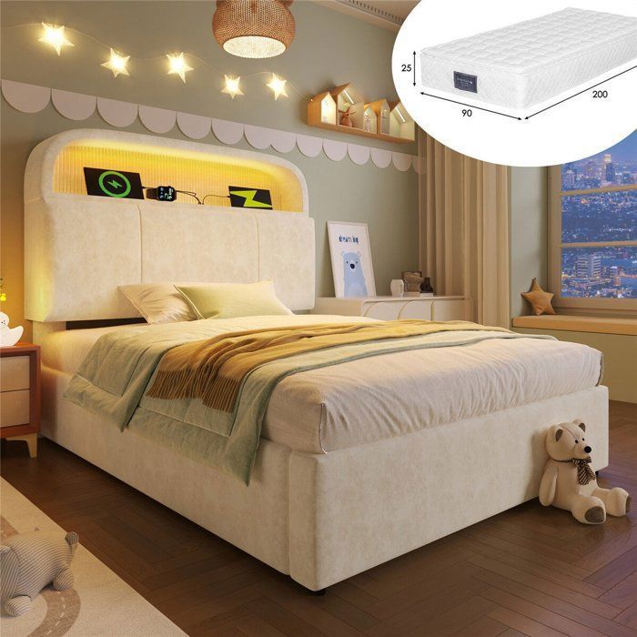 Lit coffre 90x200 avec sommier et matelas LED et port USB lit une place tête de lit rembourrée ajustables pour ado velours beige