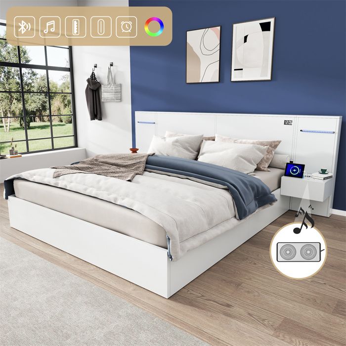Lit 180x200 avec Sommier et Bluetooth Lit Double avec Horloge Digitale et LED USB Lit pour Adulte Ado 2 Tables de Chevet Blanc