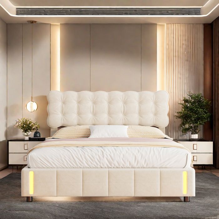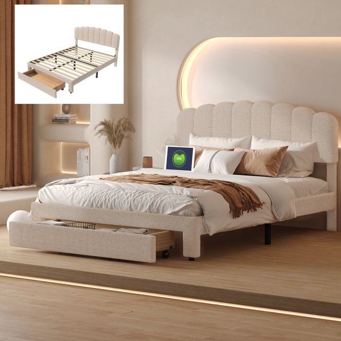 Lit double rembourré 160x200 - HOFURNI - Beige - Tête de lit incluse - Sommier à lattes - 250 kg max
