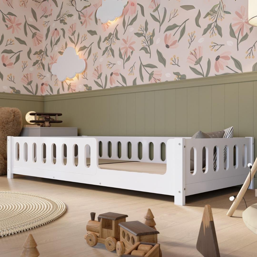 Crazy Pine Lit d'enfant 140x200 cm - Blanc - Lit au sol Montessori avec protection antichute 40cm et barrière ouvrable - Crazy Johnny
